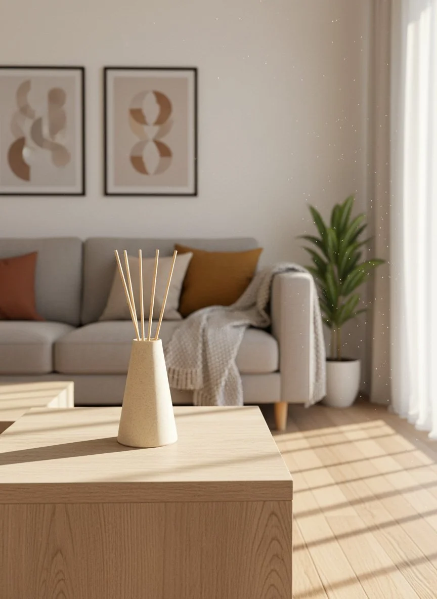 Un difusor decorativo con base de PLA mate y proveta de cristal que acompaña los espacios con aroma y calma.
