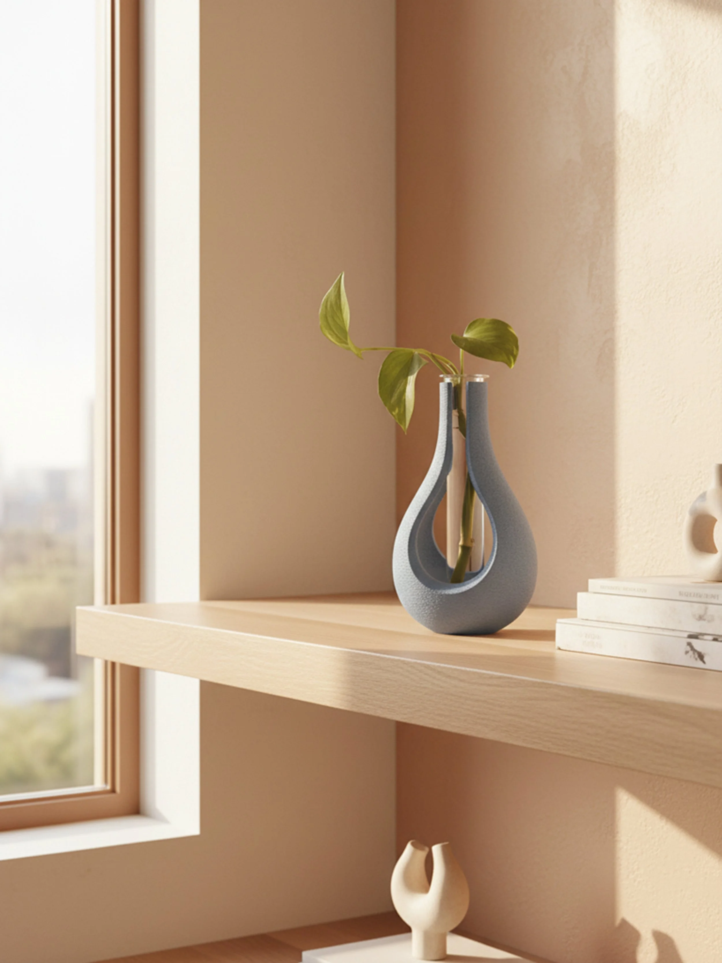 Nuevas formas orgánicas que acompañan el crecimiento con BROTS Gota de sobremesa, una pieza decorativa artesanal impresa en 3D que sostiene una probeta donde podrás ver crecer esquejes, mini plantas y raíces en agua.